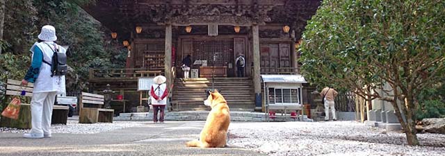 本堂では昨夜の立江寺宿坊で一緒だった車遍路の方とお会いしました。ワンちゃん連れだったみたいです。ご主人が納経してるのを繋がれてもないのにお座りして待ってます。お利口さんです。 北舎身が嶽のお大師さまも見に行きます。何を見てるんでしょうか。