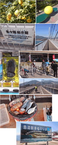 みかんにしてはやけに黄色いなぁと思って、近くで見てみるとレモンでした。樹上完熟レモンは甘いの?酸っぱいの?誰かいないか探しましたが、誰もいなかったので疑問のままです。 誰か教えてください。 昨日は気付かずに通り過ぎましたが、多々羅大橋に「鳴き龍」という面白い現象があります。橋脚の形状が理由で、音の反響が連続して聞こえる、というようなものです。 他にも昨日は寄らなかった観光スポットにも寄ってみます。 昨日と比べてサイクリストが多いです。 すれ違う人に自然と挨拶する雰囲気です。 平和です。 が、今日はかなり全力で午前中を走り抜けます。理由は、大島にある「道の駅よしうみいきいき館」の炭火七輪バーベキューをどうしても食べたかったから。 ちょうど昼ご飯時に到着し、さっそくお店へ。 店内で好きな食材を選んでレジを済ませた後、テント内の七輪席で自分で焼いて食べます。 これがウマイ。 海鮮ネタが新鮮だからか、とても旨いです。 この道の駅には渦潮を見られる観覧船などもあり、見てみたかったですが、時間の問題もあり諦め先へ進みます。 |