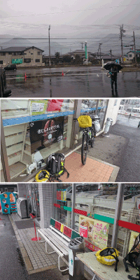 早いです。 これもこれまでの経験から学んだのですが、雨の日は晴れの日より小まめに休憩し、濡れた体をタオルで拭いて体を冷やさない事が大切です。ホットコーヒーなんかも飲みます。 一旦体の芯まで冷えてしまうと、もう動けなくなるので。 コンビニの店前に置いてあるベンチが有り難いです。 |