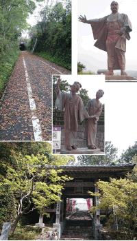 今朝は、安芸市の宿から三菱の創始者である岩崎弥太郎の生家を見てから、大日寺に向かった。 安芸市から自転車道を西へ西へ。 とても整備されて走りやすい道だ。途中には坂本龍馬の妻のお龍さんの銅像を見たり、海を見たり。 自転車道は元々は、鉄道が通っていた道だと教えていただいた。桜吹雪の中を走ったり、この季節なのに落ち葉の上を走ったり、風もとても心地好い‼ 宿からちょうど15キロ付近で、昨日と同じように左膝にピリピリと刺すような痛みがはしるようになった。 それでもペースを落としたり、歩いたりして前に進むしかない。これも修行だと思って! 大日寺に到着したのは予定よりも45分遅れになってしまいました。 境内はとても静かで、入り口には紅葉の残りが!秋に色づいた紅葉も綺麗だろうなと思いながら後にしました。 |