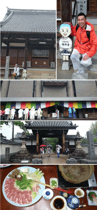その後、その方は「寒くて走れない」との事で宿に向かわれ、私は約20キロちょっと離れた、香園時へ向かった。 20キロならば、1時間から1時間半あれば着くかなっと思っていたら、雨と寒さで思うようにスピードが上がらない。 橡生の道の駅で温かいラーメンをいただいて再スタート。 しかし、なかなか香園寺に到着しない!コンビニに寄っても、寒さで震えが止まらないくらいだった。 やっとの思いでが香園寺に到着。香園寺は近代的な2階建ての大きな建物で、イマイチ趣を感じないお寺です。 それから、宝寿寺・吉祥寺と参拝した。 吉祥寺では納経帳に記載してくださる方までが寒さを心配して下さり、私の今夜宿泊する宿を雨の中、外まで出て来て親切に説明して下さいました。 宿に着いて、着ていた服などを干し、夕食に食堂へ行くと、鍋料理が一人づつ用意されていました。一人前の量が多くてビックリです。 お腹がいっぱいになったし、明日の横峰寺に備えたいと思います。 |