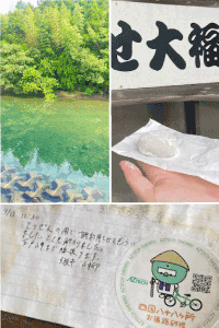 天気もいいので景色がいい。これだったら全然走れるわと思いつつ漕ぐ漕ぐ、向かい風が強い!進まない!まー道のりは長いゆっくり行こう。 四国に来てよく思うのは、川が綺麗!四万十川は有名だけど他の川もめっちゃ綺麗。普段、淀川、大和川ばかり見ているからかもしれませんが。これを四国の方に見られたら一緒にすな!と怒られそうですが(笑) 順調に進んでいると、なんとさばせ大福が、1個80円これは食べなければと購入。中はこし餡で食べている時間タイミング色々あるだろうが、1番うまい大福だと思った。...それにしても人がいない。 今日は日差しも暑さもキツいのであまり外には出られないのもあるかもしれませんが、いない。いる人は工事関係の方のみ、お疲れ様です。 そんな時急なゲリラ豪雨!タイミングよく、休憩所があり一時避難。お遍路ノートがあったので書き込み!運が良ければ瓶の牛乳がいただけるらしい!僕は運がなかった笑雨も上がり県境へ、先週降り立った徳島県とも一旦お別れ、ついに高知県へ! |