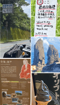 室戸岬まで最後のコンビニを発見。今日は素泊まりなのでここで夕食を購入!その先に夫婦岩が。知ってはいましたが初めてみました!ここまで来たのに誰にも会えない。 途中コンビニでバイクのツーリングの方々に「全然おらんねぇーこの時期はシーズンオフやからねぇ三連休明けから周るんかな?」と、なるほど! お遍路の話をするタイミングがない、地味なアップダウン、向かい風などもあり気持ちが爆発しそうだったのでこれはマズイと思い海を見て少しゆっくりしました。 休憩を挟むと何故かスッキリ!思ったより時間が経ってしまって、24番札所に間に合わない。 明日行こう、という事で室戸岬手前にある室戸世界ジオパークセンターに行ってみます!ジオパークは、自然、歴史、文化に触れ自分との関わりを知れる場所。という事はそう弘法大師の歴史も!映像までありかなり分かりやすかった。八十八ヶ所の地図もあり今後の予習も!まだまだ始まったばかりを痛感。。。ジオソフトをいただいて、ここから10分程度の今夜宿まで移動。 今日は約90キロ走った。しっかり大浴場で足の疲れをとります。 明日は行きそびれた24番札所から! |