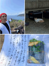 その後、道中で出会ったサイクリストの方に「宿毛まで行くならショートカットできるら県道もあるけど国道を行きな」と言われたので国道で宿毛を目指す事に、途中叶崎に寄ってみる。ここはたくさんの野良猫達がいる噂があり少し寄ってみたかった! ....いない。 さすがに暑すぎるかーと思っていると、、居た。さすがに暑いから日陰でのんびりしていた。やっぱり猫は可愛い。 僕はあんまりのんびりしてられないので、そこそこに出発。 道の駅大月に着き、青岬さんで頂いたお弁当をいただきました。手紙も添えてあり優しさと元気を、もらいました。 美味しかったです。ご馳走様でした。 |