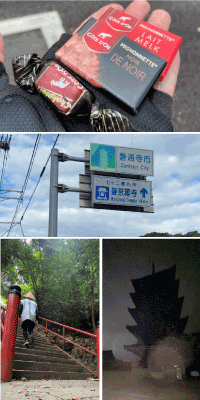 ドムさんに1枚写真をお願いすると恥ずかしいよとの事。これには理由があり、ずっと話している最中、彼はパンイチでした! 「暑いからこれがいいんだよ」とのこと。 ドムさん・・・「あなたが️クレイジーだよ」と思う。 日本に魅了されていつか遍路宿をやりたいそう。ドムさんがやる遍路宿、絶対面白いはず。。もし日本でやる事があれば教えてねと連絡先を交換し、弥谷寺を目指す。 ドムさんからベルギーチョコのお接待をいただいたので、糖分をとり順調に進みましたが、弥谷寺は坂と階段が地味にキツい。暑さと共に襲ってきた。 無事参拝し72、73番を打ち終わった頃、16時過ぎ善通寺の宿坊に向かいます。 今日は食事のみの団体さんがおられるとのことで夕食はなく、朝食のみだったので、近くで食事を済ませました。その後夜の善通寺を少し散策。夜は夜で風情があっていい。 ある意味、朝食だけでよかったかもと思いました。 |