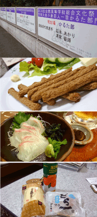 四国の学校は垂れ幕が多く、~出場や、優勝などを見て、優秀な学生さんが多いのかなと思った。 あと、学生さんはほとんどが挨拶をしてくれる。 男女問わず。 そして自転車は自分より速い(笑) 少し残念なのは、バス停などでほとんどの学生が携帯をいじっていること。 時代だなぁ。 そして宇和島市へ。 森の宿ユースホステルに宿泊。 晩ご飯なしなので、じゃこ天をいただきに宇和島に行く。 鯛が美味いと聞いていたので、居酒屋でいただくことに。 しかし、ちょっと残念でした。 たこ焼を食べながら戻ることに。 畑田本舗の栗タルトを食べて寝ます。 お遍路で体重はもちろん減ったけど、食べてばかりでリバウンドしそう(笑) |