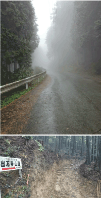 途中、少し乗れるぐらいの道になり自転車にまたがるが… えっ!?力が入らない。 そんなに体力を消耗していたのか? 違う。必死になっていたため、昼ご飯を食べていなかった。 それが影響しているのか? 何回かまたがるが、やっぱり体が言うことをきかない。 何とか押して歩くことはできる。 時間は14時すぎ。不安になったが、焦らなくてもきっと行けるハズ。 出石寺まで残り7キロ。横にはへんろ道で3キロの標識。 だが、へんろ道もかなりグチョグチョになっている。このまま押して上がるしかない。 こっから先は気力だけで上がる。雨が降り注ぎ、真っ白な霧のなか、無心だった。 寺に近づくに連れて、2台ほど車が上がっていく。道は間違っていない。 まもなく、鐘の音が聞こえてきた。もう少し! 最後の力を振り絞り、登りきれば… |