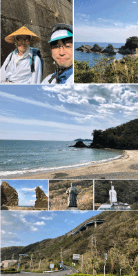 お勤めの為、本堂に。 すると、同じ宿坊に泊まってた方がちょうど出発するところで、お勤めには行かずに先を急ぐとのこと。 僕が今日の目標は室戸岬と話すと、 「室戸岬着くのはは2~3日後かな」。 改めて歩き遍路さんの過酷さを感じました。 お勤めでは、参加者は僕1人だけで少し緊張しながら本堂の中に入ります。正座をしてお経を聞くと思っていましたが、椅子に案内されお経が始まりました。 住職さんのお経は、ずっしりと体の中に響き圧倒されるものでした。 般若心経を読むくだりになり、本物を聞いて勉強しようと耳を澄ませる。すると、太鼓がリズムに合わせて入り、お経がはっきりと聞き取れず・・・ お勤めのあと、住職さんからお寺についてのお話をしていただきました。 本堂の裏にお秘仏が祀ってあると聞き、裏にまわってみると、ひっそりとお賽銭箱が置かれていた。 こちらにも手を合わせて薬王寺の巡礼は終了。 さて、ここから70㎞越えの長旅だ! |