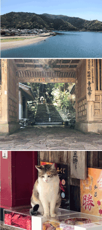 36番青龍寺まで向かう途中、宇佐大橋が清々しく最高でした! 右も左も海で、堤防には釣糸を垂らしているおじいさんや小学生がちらほら。 自然と住む人の日常を同時に眺められて良いですね。 穏やかな気持ちになります。 青龍寺に着くと、山門の先に伸びる急階段。 よし、これも修行だ! 登っていると、このお寺の雰囲気にのまれていく感覚に。 表現しづらいのですが、何か引き込まれていくような。 その場所が持つパワーってやつなんでしょうか? 静かな気持ちで納経をした後、納経所に寄るのを忘れて一度外に出てしまう。 それに気付き慌てて戻ると、行きには気づかなかった看板を目にする。 「是れより上は聖域です ペットを連れていくことを禁じます」 うん、納得。本当についさっき不思議な力を感じましたから。 看板のすぐ後ろにある納経所に行くと・・・ ん?ネコ? おみくじ箱の上にネコが。 看板見た直後だったので思わず笑ってしまいました。 まあ、野良猫だからOKですよね! |